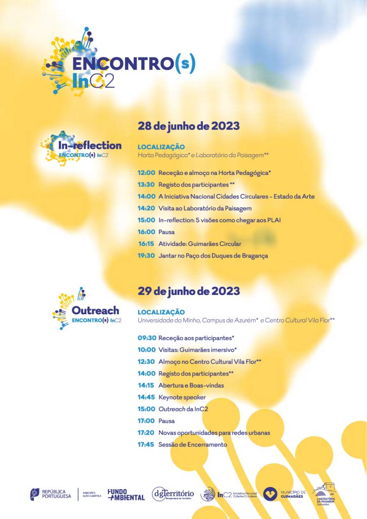 O primeiro encontro, denominado In-reflection, acontece no dia 28 e será dedicado à análise e celebração interna dos resultados finais do trabalho das Redes Cidades Circulares, sendo de acesso reservado aos municípios que integram as quatro Redes Cidades Circulares, peritos, membros da Comissão de Acompanhamento da InC2, do Secretariado Técnico e convidados destas entidades.