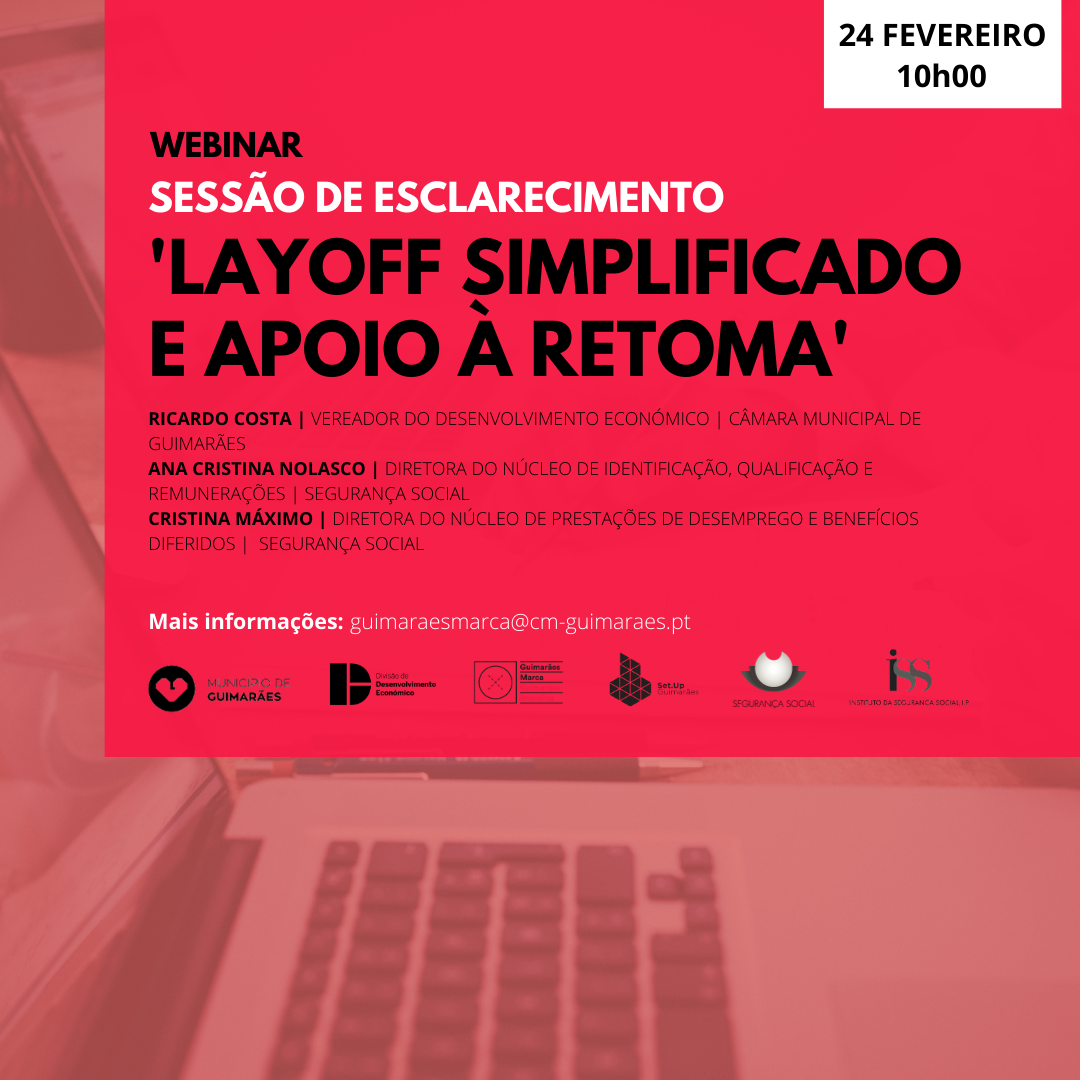 Com vista a dar resposta à atual conjuntura e, sobretudo para esclarecer as  empresas do Concelho de Guimarães, o Município de Guimarães está a organizar um WEBINAR em parceria com o Centro Distrital da Segurança Social de Braga sobre o tema ‘Layoff Simplificado e Apoio à Retoma’, a decorrer no próximo dia 24 de fevereiro, pelas 10h00 horas.